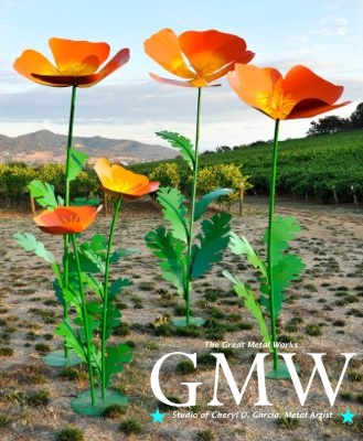 As you can see by the above photo, Cheryl is an accomplished artist, specializing in metal.  The poppies that you see in the photo adorn a field on the road to Jacksonville, where Cheryl and her husband, Chris live.  She told me that the log cabin that they live in was once lived in by the granddaughter of Daniel Boone.  I can just imagine the stories that those walls might tell!