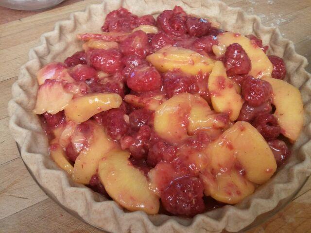 Then yesterday I finally got around to making a pie for a couple who I’d been thinking of for some time. I’ve known Alma and Bill for years and have admired them for many reasons and once had even brought a pie to church for them! That particular day, Alma and Bill were not at church and so instead I went with my intuition and gave the pie to another. That would not happen this time! I chose to make them a Raspberry Peach Pie… because the peaches were so fragrant and the berries bright and beautiful. Here is the before baking photo…. lovely isn’t it?