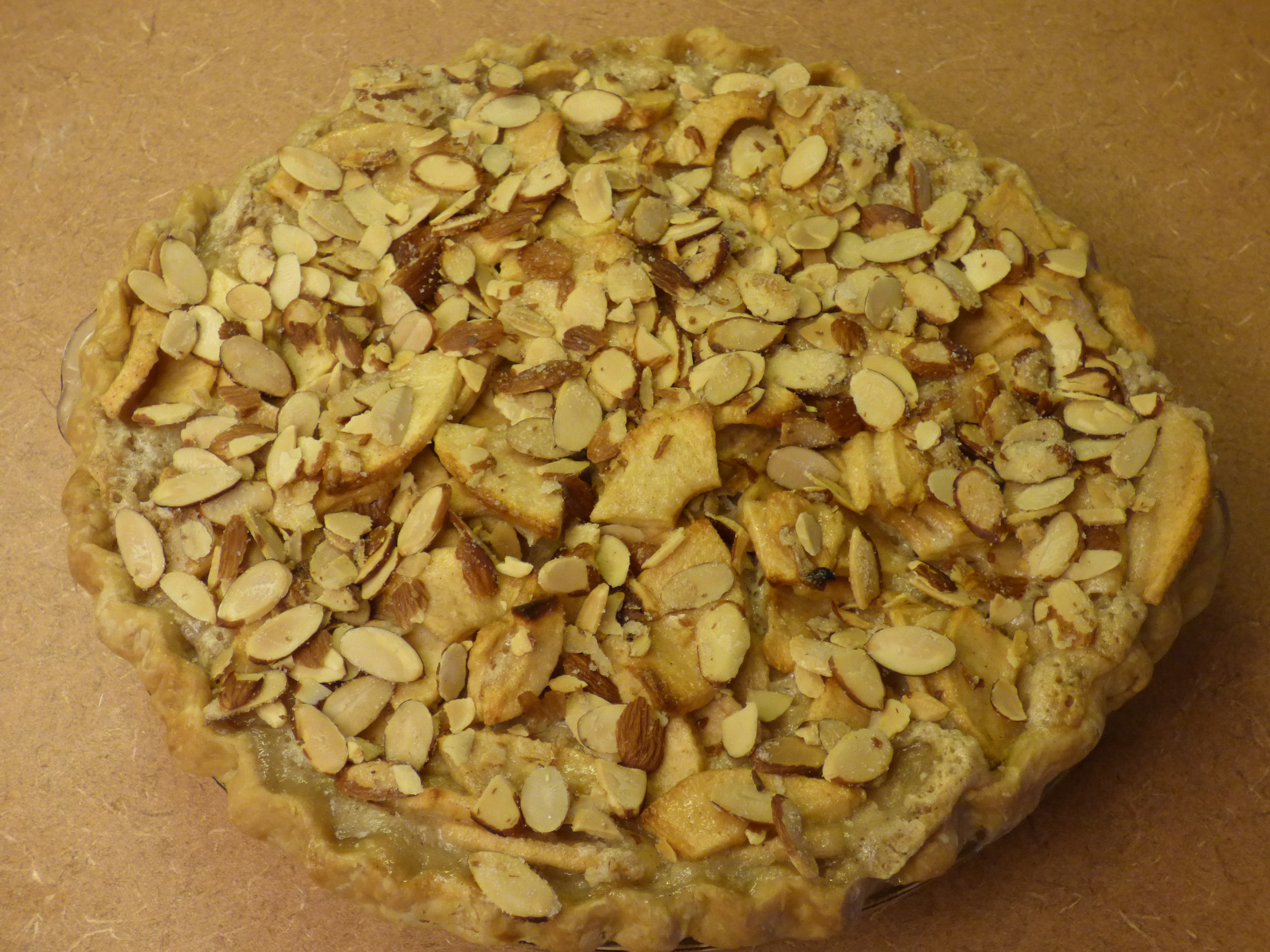 It took a trip to the store to gather some ingredients before I could bet started… apples, mushrooms, eggs… and then the pie making began. It was far from an orderly process, but before long, I had made the pie dough made (two kinds – one “regular” and one that was gluten-free). Then it was time to cook the vegetables for the quiches – one with broccoli and mushrooms and one with asparagus. When those two pies were in the oven, I got the apple pie going. Finally, after a few hours, I had three pies sitting on my counter.